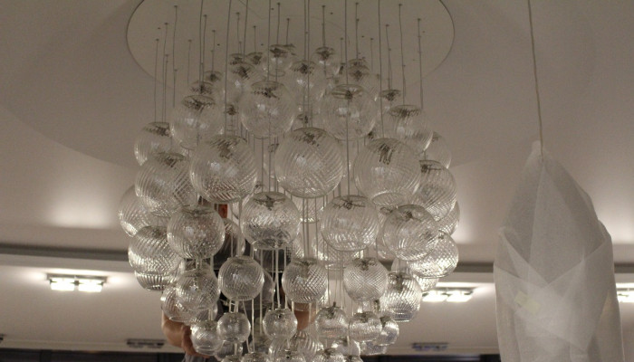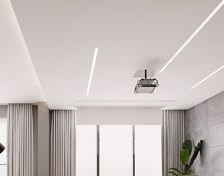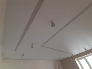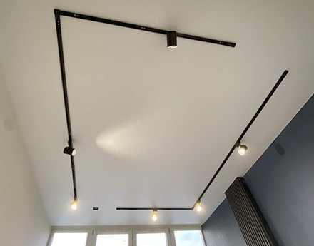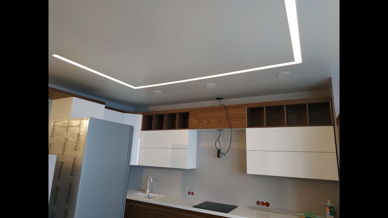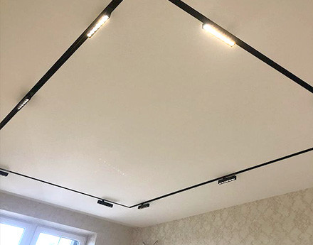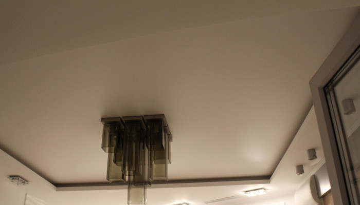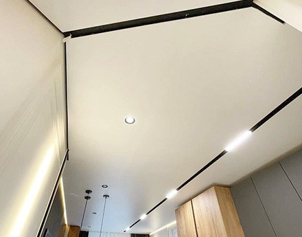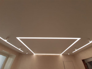 Установка многоуровневого потолка обычно происходит в два этапа. В первый день устанавливается каркас потолка, устанавливаются закладные под освещение, к стенам крепится багет. После изготовления формы каркаса и согласования его с клиентом, потолок снова замеряется. На следующий день полотно выкраивается, а затем устанавливается.
