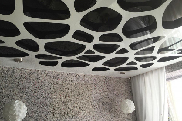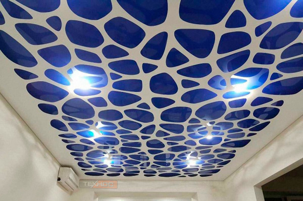 Перфорированные резные натяжные потолки имеют нестандартный внешний вид, но при этом они сохраняют все преимущества классических моделей. Их конструкция состоит из двух пленок – одна имеет резные отверстия, создающие дизайн потолка, вторая является цельной. Дополнительно в резные потолки могут монтироваться светодиодные ленты, с помощью которых удается подчеркнуть резные элементы, выполненные по технологии Apply.